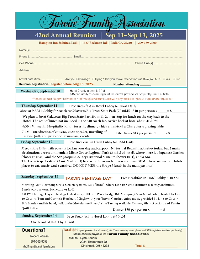 Latest News-All are welcome to join us at the 2025 Tarvin Family Reunion. This year, the reunion will be held September 11-13 in Lodi, California. A block of rooms with a special rate has been reserved for us at the Hampton Inn & Suites, 1337 Beckman Rd, Lodi.Read the invitation message from President Roger Hoffman. Here are the highlights:
