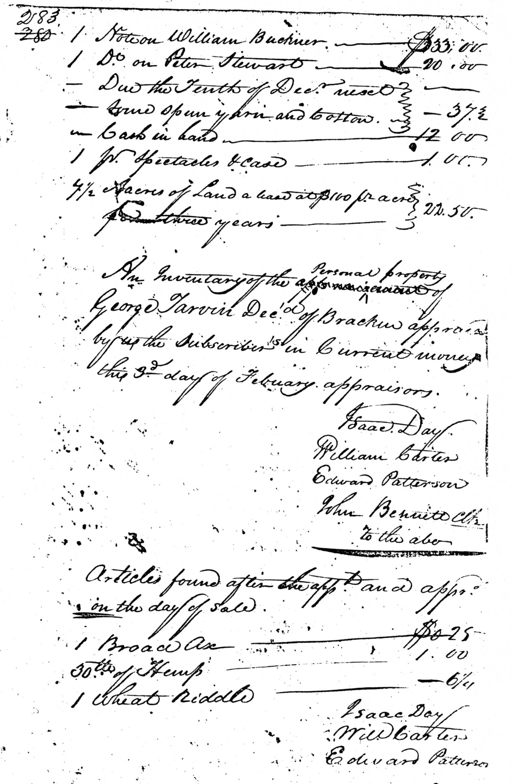 An Inventory of Personal property of George Tarvin Dec'd of Bracken appraised by us the Subscribers in Current money this 3d day of February. appraisers.
